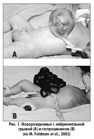 Эмбриональная грыжа представляет собой выпячивание органов брюшной полости, в том числе иногда и печени, в месте прикрепления пуповины. Как правило, размер дефекта брюшной стенки не превышает 4 см (рис. 1, А). Органы брюшной полости не изменены, они заключены в мембранозный мешок, к которому прикреплена пуповина. В некоторых случаях имеются только рудименты мешка. 75% новорожденных с эмбриональной грыжей имеют внекишечные врожденные дефекты, чаще всего трисомию 13 или 18, а также синдром Beckwith-Wiedemann (также известный как синдром пуповинной грыжи – макроглоссии – гигантизма).