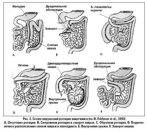 Нон-ротация встречается с частотой в 0,2%. Левостороннее положение слепой кишки вызывает большие сложности в диагностике острого аппендицита. Дефект зачастую сопровождается другими аномалиями, например, эмбриональной грыжей, гастрошизисом, дуоденальной атрезией и/или стенозом, дивертикулом подвздошной кишки, билиарной атрезией, кольцевидной поджелудочной железой и неперфорированным анусом. Отсутствие вращения пупочной петли наблюдается только в сочетании с врожденной пупочной грыжей. Остановка ротации кишечника на II стадии (мальротация) проявляется тремя изменениями. Слепая кишка поворачивается и фиксируется, но двенадцатиперстная кишка этого не делает, что ведет к ее ущемлению связками (пучки Ледда) (рис. 2, В). Менее распространен случай, когда слепая и двенадцатиперстная кишки поворачиваются в противоположном направлении, вызывая блокаду толстой кишки вследствие компрессии извне верхними брыжеечными сосудами (рис. 2, С), или же дуоденальная петля поворачивается в обратном направлении при нормальной ротации слепой кишки, заключая тем самым тонкую кишку в ее брыжейку с формированием внутренней грыжи (рис. 2, Е). При нарушениях III стадии ротации кишечника дуоденальная петля поворачивается в правильном направлении и фиксируется, но этого не происходит со слепой кишкой, что приводит к отсутствию надежной фиксации слепой и восходящей кишок. Слепая кишка слабо зафиксирована и расположена высоко в правом верхнем квадранте с дефектными связками или без них (рис. 2, D). Высокое положение слепой кишки (сoecum altum congenitum) создает большие трудности в диагностике и лечении аппендицита. При таком расположении слепой кишки она также является подвижной, при этом формируется синдром подвижной слепой кишки (coecum mobile).