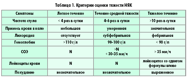 Для оценки тяжести НЯК используются определенные критерии (табл. 1 ).