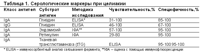 таблице 1. Серологические тесты имеют особенное значение для скрининговой диагностики у пациентов с асимптоматическим течением целиакии, неспецифической клиникой, при ассоциированных заболеваниях, таких как инсулинзависимый сахарный диабет, а также среди родственников больных. Определение серологических маркеров следует проводить до начала аглютеновой диеты в связи с тем, что уже через несколько недель или месяцев они нормализуются, такая сероконверсия используется для контроля эффективности лечения. Для мониторинга комплайенса в отношении аглютеновой диеты наиболее оптимальным считается определение АГА IgА, т.к. именно они наиболее быстро нормализуются при адекватном лечении.