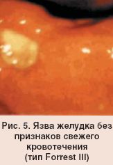 У 20% больных с чистым (белым) дном (F III) при морфологическом исследовании в дне язвы обнаруживают эрозированный сосуд. По-видимому, белый цвет сосуда маскируется фибрином и не виден при эндоскопическом осмотре. Эти данные подчеркивают значимость клинической картины и лабораторных данных для эндоскописта, который определяет риск рецидива кровотечения у данной категории больных ошибочно, как минимальный, что обусловлено определенными ограничениями обычной визуальной оценки. Использование видеоэндоскопа и допплеровского исследования повышает возможности обнаружения сосуда в дне язвы.
