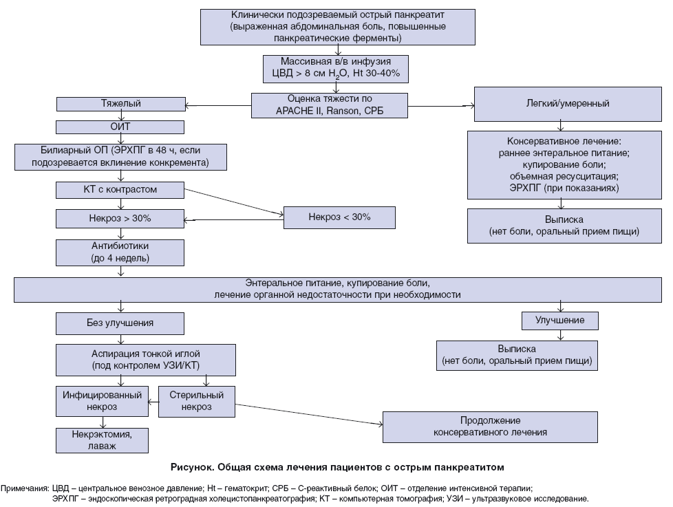 Лечение пациентов должно, по возможности, осуществляться многодисциплинарной командой, в которой доминирующая роль принадлежит врачу ИТ, в случае необходимости нужно незамедлительно привлекать специалистов по эндоскопии, эндоскопической ретроградной холангиопанкреатографии (ЭРХПГ), хирургии и радиологии.