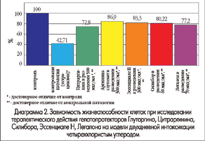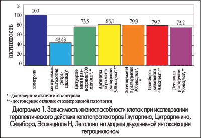В результате проведенного исследования установлено, что Глутаргин в значительной степени восстанавливает жизнеспособность культуры гепатоцитов при интоксикации тетрациклином и тетрахлорметаном.