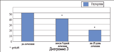 - Включение Глутаргина в комплексную терапию больных острым вирусным гепатитом способствует более интенсивному, чем в контроле снижению уровня аммиака в крови (в 1,8(0,2) раза за 5 дней — после инъекции). После полного 25-дневного курса лечения Глутаргином (инъекции + таблетированная форма) уровень аммиака в крови снижался более интенсивно в достоверных пределах (диаграмма 3).