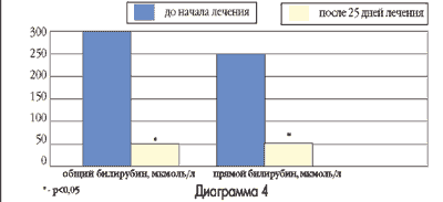 - Глутаргин оказывает положительное влияние на восстановление функции печени, в том числе и экскреторно-коньюгативную. На фоне приема препарата активно снижался уровень билирубина. Нормализация уровня биллирубина в исследуемой группе наступала в среднем на 8,2 дня раньше, чем в контроле (диаграмма 4).