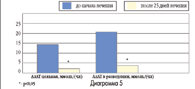 - Применение Глутаргина способствует более благоприятному течению вирусного гепатита, поскольку на его фоне более быстро, по сравнению с контролем, нивелировался цитолитический синдром, более интенсивно снижалась активность АлАТ (диаграмма 5).
