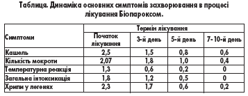 Так, вже на 3-й день лікування Біопароксом кашель зменшився у 10 хворих, спостерігалося помітне зменшення в’язкості мокроти, яку виділяли хворі, кількості вологих та/або сухих хрипів. На 5-й день лікування Біопароксом більш ніж у половини хворих кашель зник або перейшов у помірний та незначний, достовірно зменшилася кількість мокроти. Наприкінці лікування залишився незначний кашель у 3 хворих. У всіх дітей хрипи в легенях зникали протягом 5-7 днів.