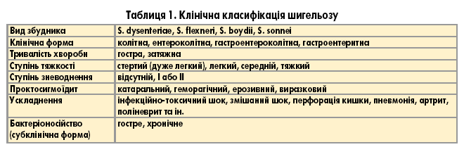 Клінічна класифікація шигельозу наведена в таблиці 1.