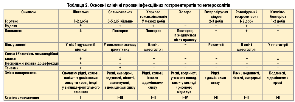 Деяку схожість з шигельозом може мати ротавірусний гастроентерит. До його особливостей належать ентеритні випорожнення, біль у верхній частині живота, відсутність колітного синдрому, розвиток катару верхніх дихальних шляхів, у крові – лейкопенія, лімфоцитоз та еозинофілія. Основні клінічні прояви інфекційних гастроентеритів і ентероколітів наведені в таблиці 2.