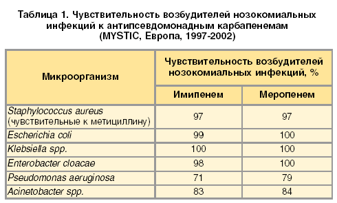 Различия между антипсевдомонадными карбапенемами в величинах минимальных подавляющих концентраций (МПК) по отношению к определенным бактериям нельзя приравнивать к различиям чувствительности этих микроорганизмов к обоим препаратам. Например, МПК90 меропенема в отношении E. coli превышала соответствующий показатель имипенема в 8,3 раза (0,06 и 0,5 мг/л соответственно), однако 100% штаммов данного микроорганизма оказались чувствительными к обоим антибиотикам. С другой стороны, активность имипенема в отношении E. faecalis превышала таковую меропенема только в 2 раза (4 и 8 мг/л соответственно). Хотя в лабораторных условиях эта разница «материализовалась» в различия чувствительности данного микроорганизма к карбапенемам (97,1% – к имипенему, 70,8% – к меропенему), клинического значения указанные различия не имеют, поскольку ни один из этих антибиотиков не является препаратом выбора при лечении энтерококковых инфекций.