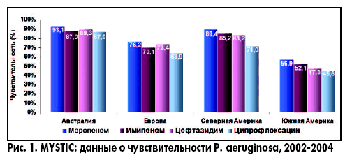 Современные тенденции резистентности отслеживаются во многих национальных и международных программах. Так, в программе MYSTIC (табл. 1) анализируются данные о чувствительности нозокомиальных патогенов, выделенных в разных странах мира в центрах муковисцидоза, нейтропений, отделениях реанимации и интенсивной терапии (ОРИТ) и общемедицинских, где постоянно используются карбапенемы (меропенем). Очевидно, что даже широкое использование карбапенемов пока не привело к существенному снижению чувствительности к ним у широкого ряда возбудителей инфекций, за исключением P. aeruginosa и Acinetobacter spp. Последние данные MYSTIC также подтверждают различие потенциалов развития резистентности синегнойной палочки к карбапенемам. Так, в интерконтинентальном масштабе чувствительность P. aeruginosa к меропенему является наивысшей по сравнению с другими антибиотиками (рис. 1).