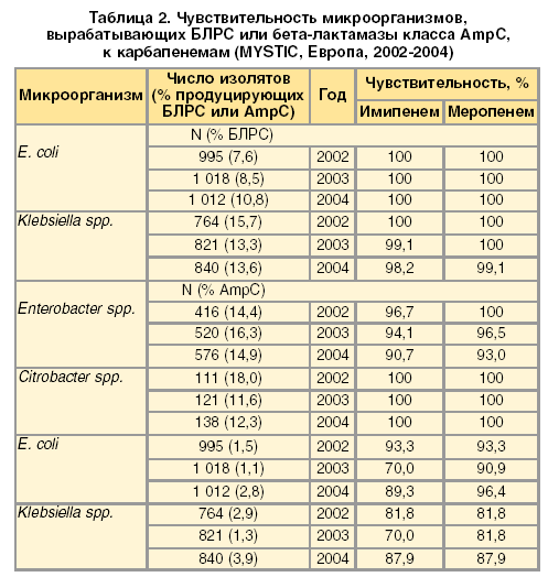 Результаты определения чувствительности in vitro неизменно подтверждают превосходство карбапенемов перед другими классами антибиотиков по активности в отношении продуцентов БЛРС. При этом МПК меропенема нередко ниже, чем имипенема, однако клиническое значение этого факта остается неизвестным.