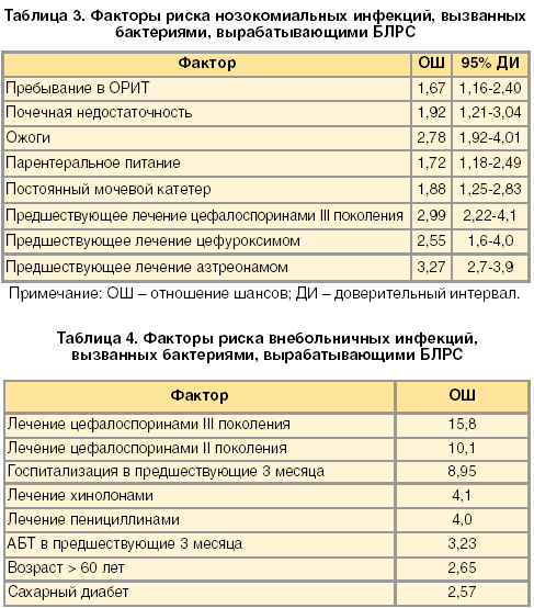 Карбапенемам следует отдавать предпочтение в терапии инфекций кровотока и вентиляторассоциированных пневмоний (ВР), предположительно вызванных продуцентами БЛРС. Эти же антибиотики являются препаратами выбора при других тяжелых (и, вероятно, среднетяжелых) нозокомиальных инфекциях – при наличии факторов риска инфицирования продуцентами БЛРС, а также тяжелых внебольничных инфекций, если возбудитель предположительно вырабатывает БЛРС (табл. 3, 4).