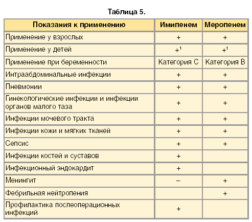 В таблице 5 представлены показания к применению карбапенемов. Информация почерпнута из листов-вкладышей к препаратам, а также русскоязычных интернет-ресурсов (поиск производился по ключевым словам «международное название», «торговое название», «инструкция», «показания к применению»). Результаты поиска оказались довольно неожиданными и нуждаются в комментариях (последнее относится и к выводам).