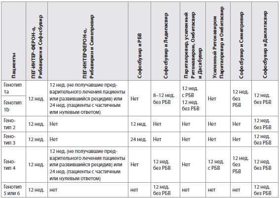 Таблица 5 Рекомендации по лечению ВГС-моноинфекции или ВГС/ВИЧ-инфицированных пациентов с хроническим гепатитом С без цирроза, включая не получавших предварительного лечения пациентов и пациентов, которым не помогло предыдущее лечение на основе ПЕГ-ИНТЕРФЕРОНА-α и Рибавирина (РБВ)