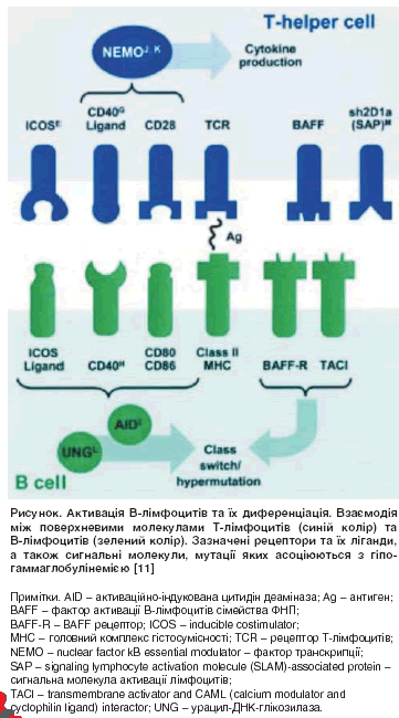 Вважають, що близько 20% хворих із ЗВІД мають порушення функції Т-лімфоцитів (погіршання функції клітин-хелперів, зменшення продукції ІL-2, ІL-4 або надмірну активність супресорних лімфоцитів) [7, 9]. Дослідження останніх років свідчать про наявність численних дефектів як уродженого імунітету, так і специфічної імунної відповіді. Зокрема, вченими C. Cunningam-Rundles та J. Bayry виявлено погіршання функції дендритних клітин. Дендритні клітини хворих із ЗВІД характеризуються порушенням диференціації та дозрівання, зниженням експресії костимуляторних молекул СD80, СD86, НLА-DR і продукції ІL-12. Це, у свою чергу, призводить до порушення активації Т-лімфоцитів та їх проліферації. Останнім часом поширеною є думка, що гіпогаммаглобулінемія здебільшого є наслідком внутрішнього дефекту В-лімфоцитів – їх диференціації та переключення синтезу імуноглобулінів.