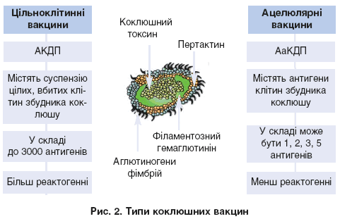 Досягненням є те, що згідно з новим календарем щеплень, у дітей з високим ризиком розвитку післявакцинальних ускладнень регламентується проведення щеплення проти дифтерії, коклюшу та правця вакциною АаКДП (з ацелюлярним коклюшним компонентом), що є менш реактогенною. Вакцинація проти коклюшу була перервана в Японії, коли дві дитини померли протягом 24 год після отримання АКДП-вакцини з цільноклітинним коклюшним компонентом. Після цього частота захворювань на коклюш зросла з менш ніж 1000 до 13 105 випадків на рік, з них 41 – смертельний. Енцефалопатія спостерігається в середньому в 1 випадку на 100 000 доз вакцини, а перманентне ушкодження мозку – з частотою 1 на 300 000 ін'єкцій. У Британії юридично було визнано, що не існує вірогідної інформації, яка б доводила, що ушкодження мозку пов'язане з вакциною проти коклюшу. Частота подібних випадків дозволяє віднести ці ускладнення до таких, які лише за терміном співпадають із проведенням щеплення. Навіть якщо застосування вакцини й пов'язане в поодиноких випадках з ушкодженням мозку, продовження щеплення проти коклюшу все ж таки рекомендується, оскільки відомо, що значно більше дітей будуть страждати від ускладнень коклюшної інфекції, якщо вакцинацію проти неї не проводити. Однак нещодавно було створено ацелюлярну коклюшну вакцину, яка показала себе менш реактогенною. Вона введена в складі АаКДП до нового календаря щеплень в Україні. Перша ревакцинація у 18 міс також проводиться вакциною з ацелюлярним коклюшним компонентом. Вона використовується для подальшого щеплення дітям, які мали післявакцинальні ускладнення на попередні щеплення АКДП, а також для проведення усіх щеплень дітям з високим ризиком розвитку післявакцинальних ускладнень за висновком вакцинальної комісії або дитячого імунолога (рис. 2).