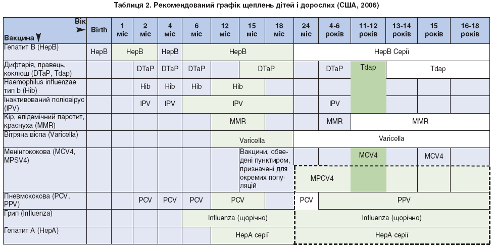 Для порівняння наводимо календар щеплень США за 2006 р. (табл. 2).