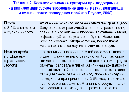 После взятия цитологического мазка рекомендуется расширенная кольпоскопия (осмотр вульвы, стенок влагалища и шейки матки) для идентификации патологически измененного эпителия. Наиболее специфичными кольпоскопическими признаками ПВИ являются ацетобелый эпителий, йодпозитивные мозаика и пунктуация, атипичная зона трансформации (табл. 2).