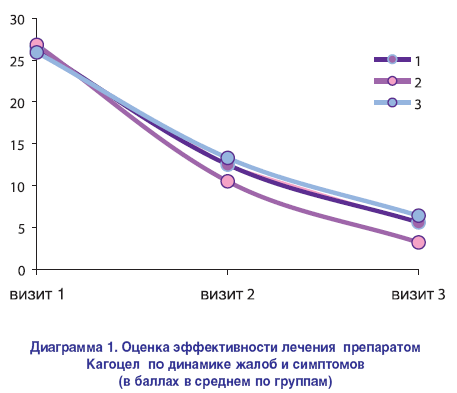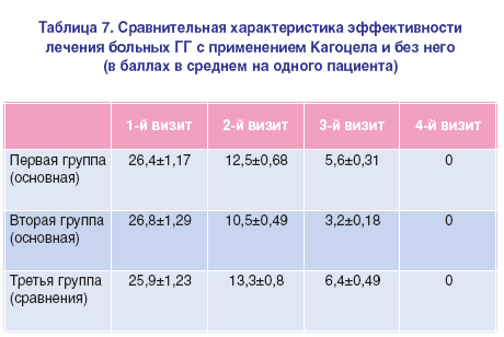 В ходе изучения клинических проявлений на 5-й день лечения больных ГГ, по данным клиники и количественной оценки жалоб и симптомов, выявлена положительная динамика разрешения симптомов заболевания. Среднее значение показателей по всем группам значительно ниже по сравнению с первым визитом (см. диаграмму 1, таблицу 7), что свидетельствует об эффективности лечения.