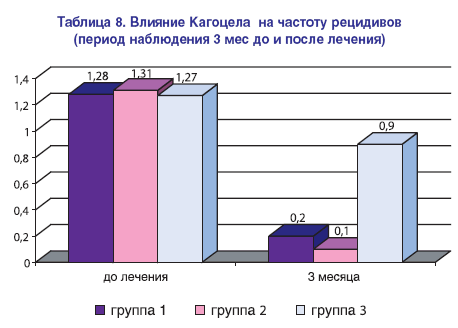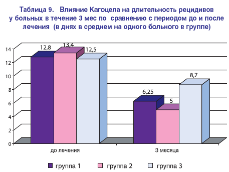 Наиболее значимые результаты лечения Кагоцелом получены на 10-й день наблюдения за пациентами. Так, сравнительный анализ клинической оценки эффективности лечения показал, что наиболее высокие результаты получены в первой и второй группах больных (5,6 ± 0,31 и 3,2±0,18 балла) по сравнению с 3 группой (6,4 ±0,49). Кроме того, лечение способствовало сокращению сроков разрешения элементов, исчезновению зуда, локальной боли и снижению длительности рецидива. Последний визит (через месяц) показал, что произошло клиническое выздоровление во всех группах. При оценке эффективности лечения по группам до лечения и через 3 мес наблюдения (диаграммы 2, 3 и таблицы 8, 9) уменьшилась длительность рецидива у больных первых двух групп в 2-2,5 раза (первая – 12,8 и 6,25; вторая – 13,4 и 5,0) по отношению к группе сравнения (12,5 и 8,7). При оценке безопасности препарата Кагоцел ни у одного больного в наблюдаемых группах не выявлено отклонения от нормы лабораторных показателей, а также не зарегистрированы неблагоприятные или серьезные неблагоприятные явления.