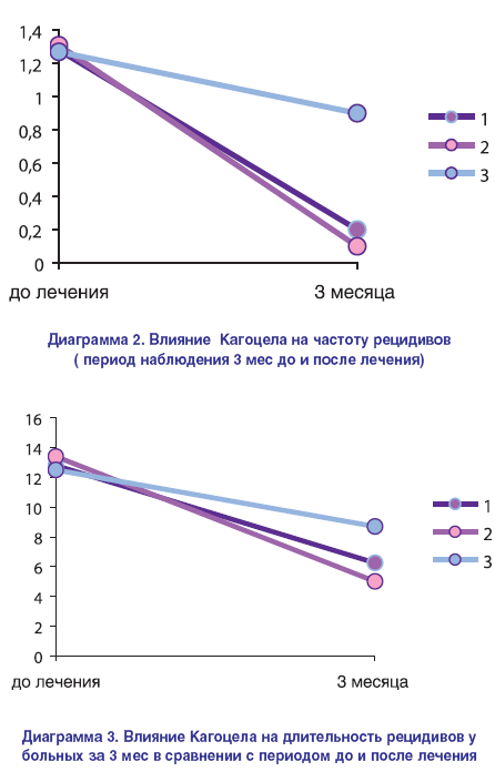 • как в моно-, так и в комбинированной терапии больных ГГ Кагоцел положительно влияет на частоту и длительность рецидивов заболевания;