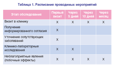 Информирование пациентов. Участников проинформировали о типе препарата и сути клинического испытания, после чего было оформлено письменное согласие на участие в нем от каждого пациента до начала проведения процедур, связанных с протоколом исследования. Исследователь сохранял оригинал подписанного информированного согласия вместе с первичной документацией данного пациента, которому была выдана копия формы согласия (табл. 1).