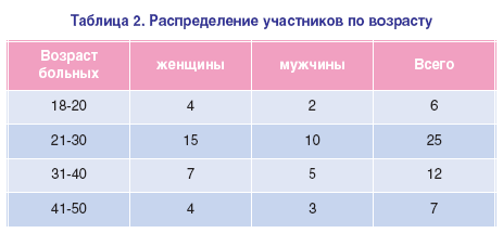 Под наблюдением находилось 50 больных ГГ: 30 (60%) женщин и 20 (40%) мужчин в возрасте от 18 до 50 лет, причём 31 (62%) пациент – в возрасте до 30 лет (табл. 2).