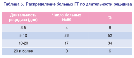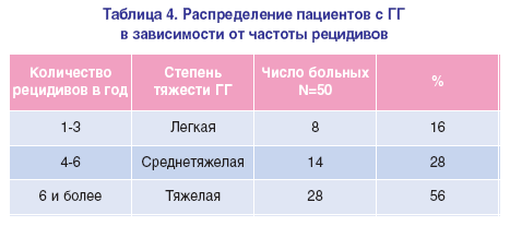 Важной клинической характеристикой у пациентов с ГГ является частота и длительность течения заболевания (табл. 4). Из таблицы следует, что у 56% больных было тяжелое течение ГГ (более 6 рецидивов в год).