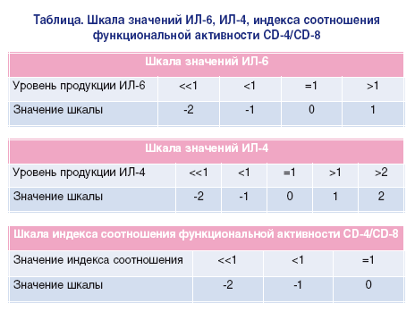 Шкала значений ИЛ-6, ИЛ-4, индекса соотношения функциональной активности CD-4/CD-8 приведена в таблице.