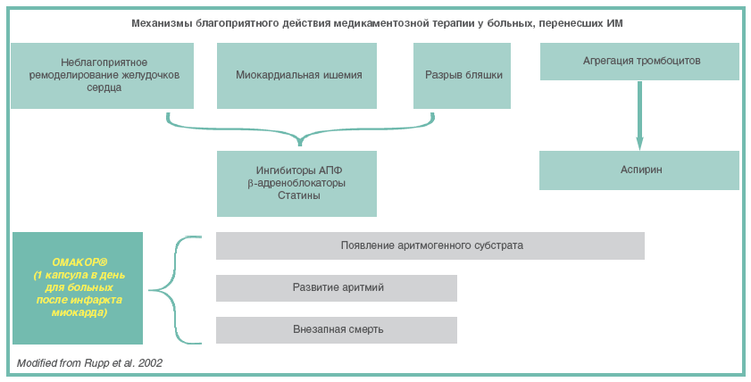 Омакор в дозе 1 г/сут воздействует на аритмогенный субстрат и риск развития аритмий. Необходимо заметить, что Омакор никоим образом не заменяет действие базисных препаратов при лечении ИМ, а только дополняет их.