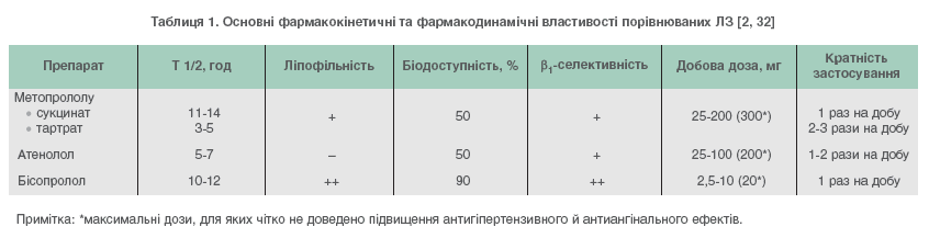 Рекомендовано для застосування три препарати – метопрололу сукцинат, атенолол і бісопролол [22, 23]. Протиішемічна активність метопрололу сукцинату в дозі 200 мг 1 раз на добу була достовірно вищою за таку ніфедипіну-ретарду в дозі 20 мг 2 рази на добу, особливо при більшому значенні подвійного добутку (ЧСС, помножена на систолічний АТ) в спокої та на фоні порогового фізичного навантаження, а також при вищому показникові функціонального класу, що було продемонстровано в дослідженні ІМАGE (1995; n=280) [8, 9]. Метопролол сукцинат при спостереженні за 800 хворими протягом 3 років не поступався за впливом на загальну смертність та кількість серцево-судинних подій антагоністу кальцію верапамілу за однакової переносимості обох ЛЗ (APSIS, 1996) [8, 9].
