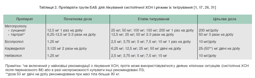 У пацієнтів після перенесеного ІМ БАБ найбільше знижували смертність у групі хворих зі зменшеною ФВ ЛШ (особливо у перші дні після ІМ, навіть у разі її подальшої нормалізації ) [41]. При спостереженні з середньою тривалістю 1 рік 3 місяці зниження смертності на 30-35% відмічено в осіб із ХСН і ФВ ЛШ<35-40% для метопрололу сукцинату (MRIFT-HF, 1999; n=3991) [42], бісопрололу (СІВІS11, 1999; n=2647) [43] та карведилолу (COPERNICUS, 2001; n=2289), що відповідає 28 пролікованим пацієнтам на рік для збереження одного життя. Зазначений ефект досягався за рахунок вираженого зменшення кількості випадків РСС більш ніж на 40% у кожному з досліджень і був зворотно пропорційним ФВ ЛШ (найвищий при ФВ <25%). Критерії терапії БАБ хворих із ФВ ЛШ <35-45%: компенсований стан (усунення ознак затримки рідини), терапія ІАПФ, титрування дози не частіше ніж раз на 7 днів із субтерапевтичної до субмаксимальної (табл. 2).