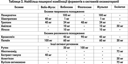 Наразі в організмі людини виявлено більш ніж 3000 різноманітних ензимів, які різняться великою субстратною специфічністю. Провідна ідея поліензимних препаратів полягає у використанні обмеженої комбінації цілого ряду різних за походженням, біохімічними властивостями, але з достатньою субстратною специфічністю, протеїназ. Окремі складові поліензимних сумішей проявляють неоднакову активність у плані наведених біологічних ефектів (табл. 1). Тому метод системної ензимотерапії використовує різні ензимні суміші панкреатина, хімотрипсина, амілази, ліпази, бромелаїну і папаїну. Окрім ензимів у склад сумішей входять рутин і гідролізат тимуса теляти. Ензимні інгредієнти одержують з яловичих і свинячих підшлункових залоз (панкреатин, хімотрипсин, ліпаза, амілаза), з стебел ананаса (бромелаїн), плодів динного дерева (папаїн) і квіток софори японської. В якості допоміжної галенічної коригенції препарати містять сахарозу, лактозу, крохмаль. Усі ці речовини комбінуються в ензимних сумішах у відповідності до бажаного впливу (табл. 2). Питання щодо вибору препарату для проведення курсу системної ензимотерапії в кожному окремому випадку має свої чіткі критерії.