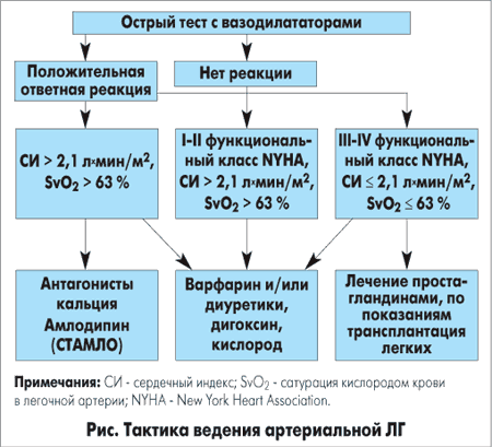 Антагонисты кальция не рекомендуется использовать эмпирически при артериальной ЛГ, так как не все больные отвечают на них. В начале терапии предлагается использовать острый вазореактивный тест, результаты которого можно экстраполировать на длительную терапию. Пробы проводят с внутривенной инфузией аденозина, ингаляцией NO, внутривенно или с использованием небулайзера энопростенола. По мнению экспертов, возможным стандартом в будущем станет ингаляционный тест с нитритоксидом. Проба считается положительной при уменьшении среднего давления в легочной артерии более чем на 20% или снижении легочного сосудистого сопротивления без уменьшения сердечного выброса. Согласно рекомендациям Британского торакального общества, общества кардиологов и ревматологов, показаниями к назначению АК являются: сердечный выброс более 2,1 лхмин/м2 и/или сатурация венозной крови > 63%, и/или давление в правом предсердии < 10 мм рт. ст. с положительной реакцией на острый тест с вазодилатирующим агентом. Согласованный протокол ведения больных можно представить в виде рисунка.