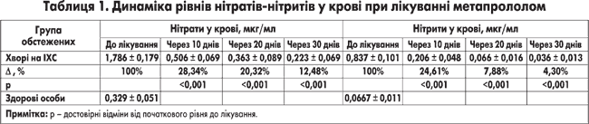 Курсова фармакотерапія метапрололом приводила до поступового неухильного зменшення вмісту нітросполук протягом 30 днів. Їх зменшення (до 28,34% для нітратів та до 24,61% для нітритів від початкового рівня) спостерігалося вже у перші 10 днів лікування. Подальше зменшення вмісту нітросполук наближалося до рівня у контрольній групі.