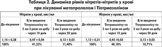 Очевидно, що такого значного падіння концентрації нітросполук, порівняно з монотерапією метапрололом, уже не спостерігається, фактично додаткове призначення Тіотриазоліну збільшує їх рівень майже вдвічі: за перші 10 днів замість зниження нітратів до 28,34% — лише до 41,23%, нітритів — замість 24,61% — лише до 40,18%, Після закінчення комбінованої терапії (до 30 днів) ця різниця зберігається, рівень нітритів при монотерапії зменшувався до 4,3%, при комбінованій терапії — лише до 10,71%. Такий результат можна вважати обумовленим захисною дією Тіотриазоліну (табл. 2).