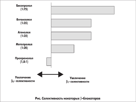 Наиболее противоречивы данные литературы о влиянии на КЖ β-блокаторов. Этот факт не вызывает удивления, поскольку β-блокаторы — очень разнообразный класс препаратов, а кроме того, существуют большие различия между неселективными (пропранолол) и селективными (бисопролол и другие) β-блокаторами (рис.). Установлено, что чем выше селективность β-блокатора, тем ниже частота побочных эффектов на фоне лечения. Следовательно, терапия неселективными β-блокаторами за счет побочных эффектов, в частности отрицательного влияния на сексуальную функцию у мужчин, может приводить к ухудшению КЖ больных АГ.