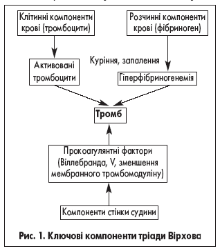 Тромбоз – ключовий етап патогенезу багатьох судинних захворювань. Саме з формуванням тромбу пов’язують виникнення ІМ та інсульту, а також розвиток судинних подій у хворих з фібриляцією передсердь і хронічною СН. Венозний тромбоз – одна з найважливіших клінічних проблем при онкологічних захворюваннях і після хірургічних втручань. Понад 150 років тому Рудольф Вірхов визначив три основні передумови тромбогенезу: порушення кровотоку, зміни з боку судинної стінки та порушення з боку клітин крові (рис. 1). Ця концепція була істотно доповнена останнім часом завдяки розумінню ендотеліальної функції, характеристик кровотоку, гемореологічних факторів, факторів тромбоутворення та фізіології тромбоцитів. Оскільки тромб переважно складається із тромбоцитів і фібрину, саме ці компоненти тромбу є основним об’єктом антитромботичної терапії (рис. 2).