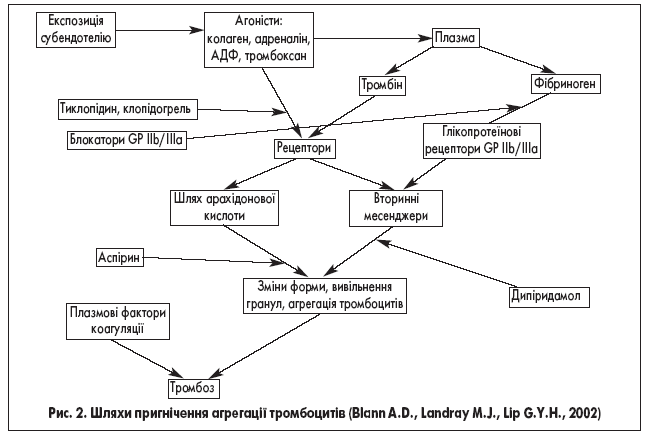 Похідні тієнопіридину – тиклопідин і клопідогрель – сучасні засоби антитромбоцитарної терапії, які можуть застосовуватись як альтернативні або як доповнення до аспірину. Сфера клінічного застосування цих препаратів включає вторинну профілактику церебросудинних подій ішемічного генезу, лікування ІХС, у тому числі при здійсненні ендоваскулярних втручань на вінцевих артеріях, а також лікування атеросклеротичних уражень різних відділів судинного русла. Механізм дії похідних тієнопіридину – пригнічення агрегації тромбоцитів, індукованої її агоністами, зокрема фактором активації тромбоцитів і колагеном, а також драматичне зменшення зв’язування АДФ з пуринорецепторами на поверхності тромбоцитів. Очевидно, цей механізм не залежить від циклооксигенази. При цьому порушується відповідь тромбоцитів на дію тромбіну, колагену, фібриногену, фактора Віллебранда. Під впливом тієнопіридинів певною мірою попереджується активація глікопротеїнових (GP) рецепторів IIb/IIIa – важливий етап процесу утворення тромбоцитарних агрегатів. Крім того, гальмується вивільнення з тромбоцитарних гранул, цитоплазми та мембранних структур різних тромбоіндукуючих речовин, факторів росту та міграції, прозапальних цитокінів. Оптимальний вплив на функцію тромбоцитів досягається через декілька днів перорального застосування тієнопіридинів.