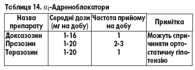 α1-Адреноблокатори (доксазозин) виявились менш ефективними, ніж тіазидоподібний діуретик хлорталідон у дослідженні АLLНАТ, у зв’язку з чим їх тепер не вважають препаратами першої лінії, придатними для монотерапії і рекомендують застосовувати у складі комбінованої терапії. Вони чинять виразну судинорозширювальну дію в результаті селективної блокади α1-адренорецепторів у судинах. Викликають зниження АТ, найістотніше при прийомі першої дози (ефект першої дози) та при переході з горизонтального у вертикальне положення. У зв’язку з цим починати лікування цими препаратами слід з мінімальної дози (0,5 мг празозину, 1 мг доксазозину). Доксазозин є препаратом пролонгованої дії, завдяки чому ортостатичні реакції та ефект першої дози при його вживанні спостерігаються рідко, на фоні празозину – часто. Основним станом, за якого слід надавати перевагу цим препаратам, є аденома передміхурової залози. Вони справляють позитивний вплив на хворих з аденомою простати завдяки тому, що зменшують ступінь обструкції сечовивідних шляхів (табл. 14).