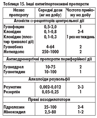 Антиадренергічні препарати центральної дії, незважаючи на достатню антигіпертензивну ефективність та суттєве зменшення частоти ускладнень АГ при їх тривалому застосуванні, відсунуті на другий план новими, більш специфічними засобами. Найважливіша причина цього – небажані ефекти, що погіршують якість життя хворих. Центральним a-агоністам (клонідин, гуанфацин) властиві седативна дія та сухість у роті, алкалоїдам раувольфії – седативна дія, набряк слизової оболонки носа, подразнення слизової оболонки шлунка; прямі вазодилататори спричиняють рефлекторну тахікардію та затримують рідину в організмі. Седативний ефект порушує працездатність, емоційний стан, знижує увагу, уповільнює реакцію хворих. Проте використання невеликих доз цих препаратів дозволяє значно зменшити їх небажані ефекти, а комбіноване застосування препаратів центральної дії з діуретиками та вазодилататорами супроводжується значним зниженням АТ при мінімальних небажаних реакціях. Досить ефективна комбінація резерпіну з гідралазином та гідрохлортіазидом (адельфан) або з дигідроергокристином та клопамідом (кристепін, бринердин, нормотенс) (табл. 15).