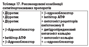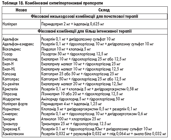 Комбіноване лікування необхідне 50-75% хворих на артеріальну гіпертензію. У випадку неефективності монотерапії не слід збільшувати дозу до максимальної, оскільки це підвищує вірогідність побічних ефектів. Краще застосовувати комбінацію двох, а при необхідності – З-4 препаратів. У хворих з м’якою гіпертензією лікування можна починати як з монотерапії одним з препаратів першого ряду, так і з низькодозової комбінації двох препаратів першого ряду (наприклад, з ноліпрелу). У хворих з помірною та тяжкою АГ у більшості випадків доцільно замість монотерапії відразу застосовувати комбінацію двох препаратів, а при необхідності – 3-4 препаратів (табл. 17, 18).