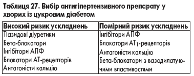 Лікування хворих на АГ із супутнім цукровим діабетом потребує врахування індивідуального ризику ускладнень і застосування залежної від цього диференційованої тактики (табл. 27). Для осіб з високим ризиком ускладнень пріоритетним завданням є зниження артеріального тиску. Можна застосовувати будь-які препарати 1 ряду, які у конкретного хворого ефективно знижують AT і не викликають побічних ефектів. У хворих з помірним ризиком ускладнень доцільним є застосування метаболічно нейтральних препаратів – інгібіторів АПФ, блокаторів рецепторів ангіотензину II та антагоністів кальцію. У хворих з незначним підвищенням AT, в яких можна очікувати його нормалізацію під впливом монотерапії, лікування слід починати з блокаторів рецепторів ангіотензину II. Ці препарати бажано також застосовувати у складі комбінованої терапії з огляду на їх добре доведену нефропротекторну дію.