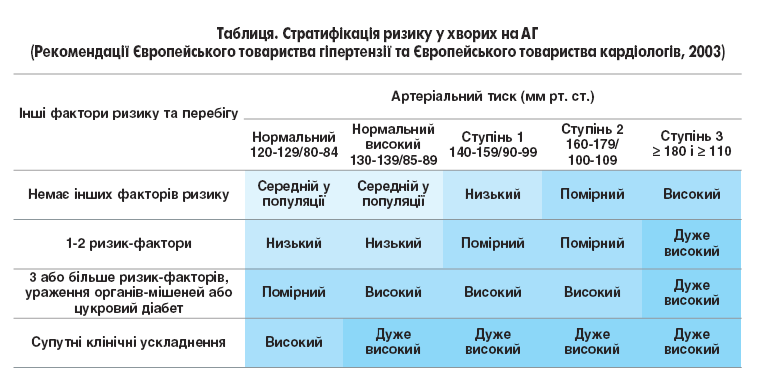 У таблиці наведено класифікацію хворих на АГ за рівнем ризику відповідно до останніх рекомендацій Європейського товариства гіпертензії та Європейського товариства кардіологів (2003). Ризик визначається в клітині, яка відповідає як ступеню підвищення АТ, так і наявних факторів ризику, ураження органів мішеней, ускладнень або цукрового діабету.