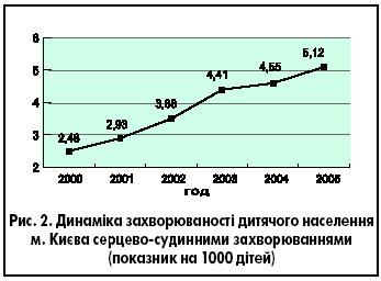 У той же час слід зазначити, що на тлі зростання серцево-судинної захворюваності у дітей (рис. 2) зросла квота саме цієї групи хворих, а також пацієнтів із групи ризику – дітей, які оглядалися дитячими кардіоревматологами з приводу будь-яких змін з боку серця, але топування діагнозу й адекватного лікування не отримували. Саме в цієї категорії хворих потенційно може формуватися стан прогресуючого ураження серцевого м'яза, інвалідизація (в дорослому віці) і, як наслідок, – високий рівень летальних випадків від хвороб серця й судин у подальшому. На наш погляд, урегулювання термінологічного розмаїття та обізнаність не лише дитячих кардіоревматологів, а й лікарів загальної практики з питань етіології, патогенезу, діагностики та лікування цих хворих є превентивним заходом у профілактиці виникнення важких, життєво загрозливих станів у дорослих.