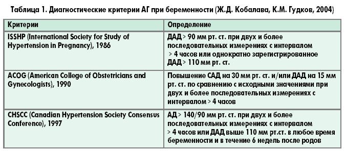 Единого определения АГ при беременности до нынешнего времени не выработано. АД диагностируется при значениях систолического АД (САД) > 140 мм рт. ст. и/или ДАД > 90 мм рт. ст. При наличии артериальной гипотонии до беременности повышение САД на 30 мм рт. ст., ДАД на 20 мм рт. ст. принимается за АГ.