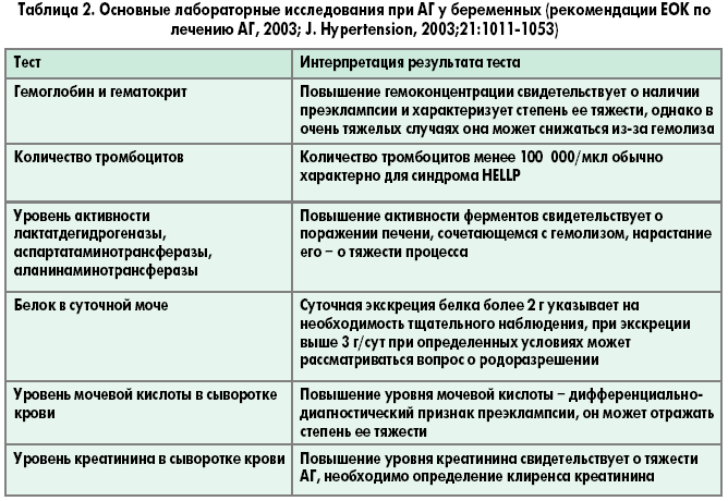 Для раннего выявления признаков преэклампсии необходимы результаты лабораторных исследований, поскольку даже при отсутствии жалоб у беременной биохимические показатели крови могут быть изменены (табл. 2). Повышение АД, изменения в крови и/или выявление протеинурии требуют тщательного наблюдения за пациенткой. Особую угрозу представляет развитие синдрома HELLP (hemolysis, elevated liver enzyme, low platelet count) – гемолиз, повышение активности печеночных ферментов, тромбоцитопения.