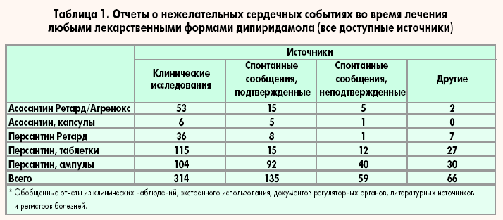 Недавно регуляторным органам ЕС был предоставлен периодический отчет о безопасности вместе со списком спонтанных отчетов о предполагаемых побочных реакциях на препарат (препараты дипиридамола для приема внутрь, парентеральные лекарственные формы, фиксированные комбинации дипиридамола с модифицированным высвобождением и аспирина). Согласно представленному в этом отчете сердечному профилю безопасности дипиридамола, число нежелательных событий при назначении пероральных форм дипиридамола, в том числе с модифицированным высвобождением, было очень низким, и лишь часть из них можно было четко связать с терапией препаратом (объем отчета почти 4,5 млн пациенто-лет). Таким образом, на сегодня существует только несколько случаев неблагоприятных сердечных событий, связанных с назначением комбинации аспирин + дипиридамол с модифицированным высвобождением.