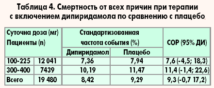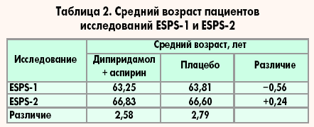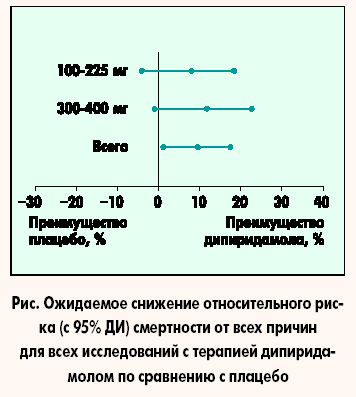Анализ базы данных рандомизированных контролированных исследований с дипиридамолом у пациентов с кардиоваскулярной и цереброваскулярной патологией убеждает в благоприятном влиянии дипиридамола на показатели общей и сосудистой смертности. Видимое несоответствие значений смертности в ESPS-1 и ESPS-2 связано с возрастными различиями.